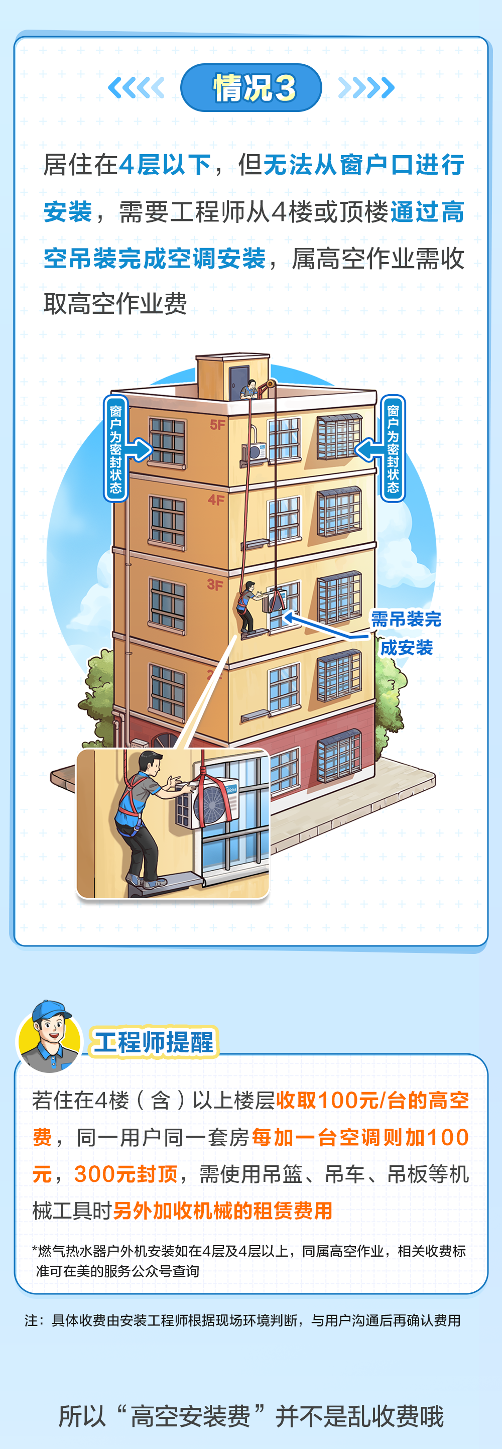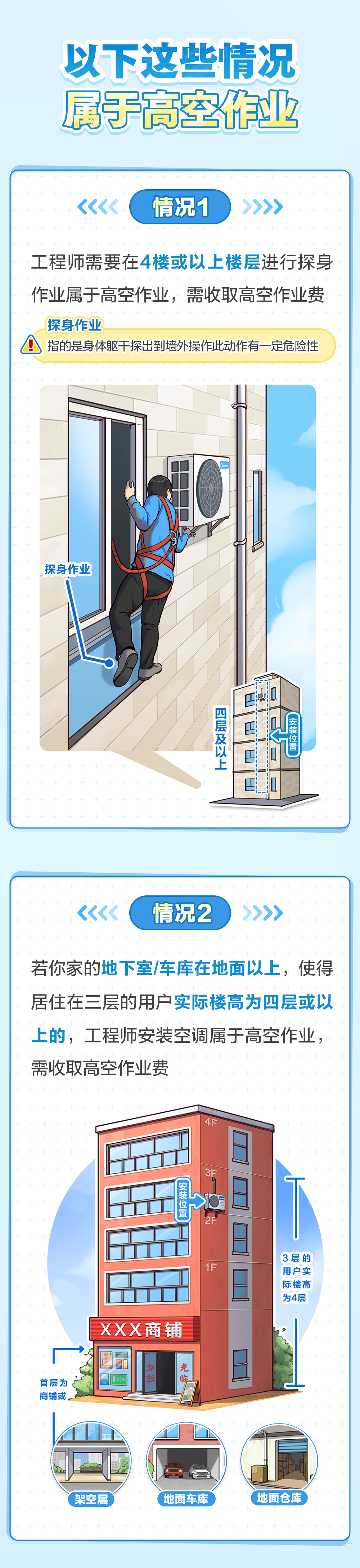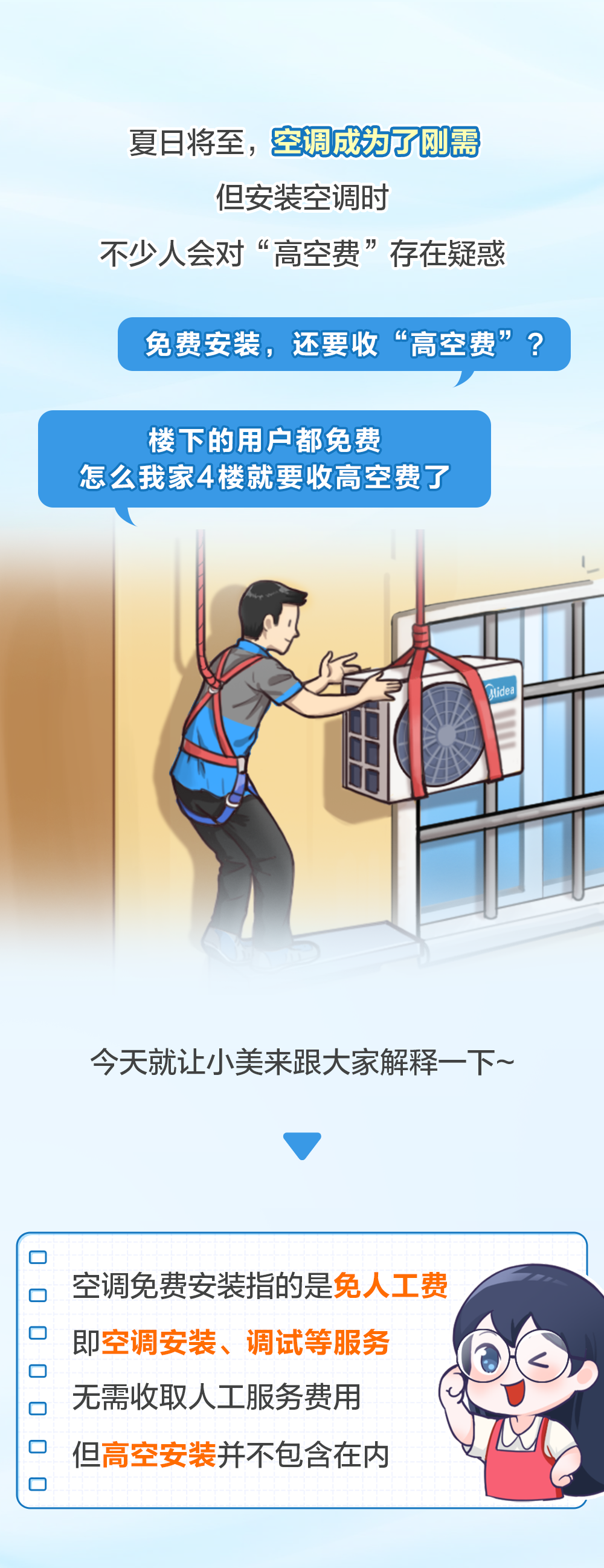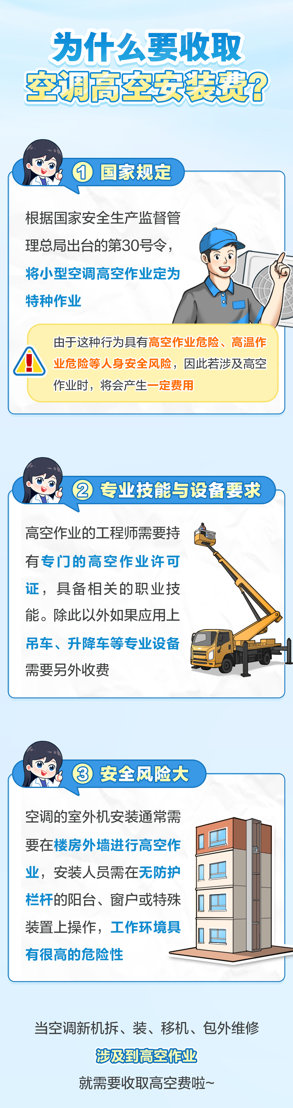 高空费是一种服务性收费,市场调价,因为师傅在安装空调外机时面临着各种风险,风险越高价钱也越高,这种风险指的是楼层高带来的生命安全风险,所以收取额外的费用也是应该的。